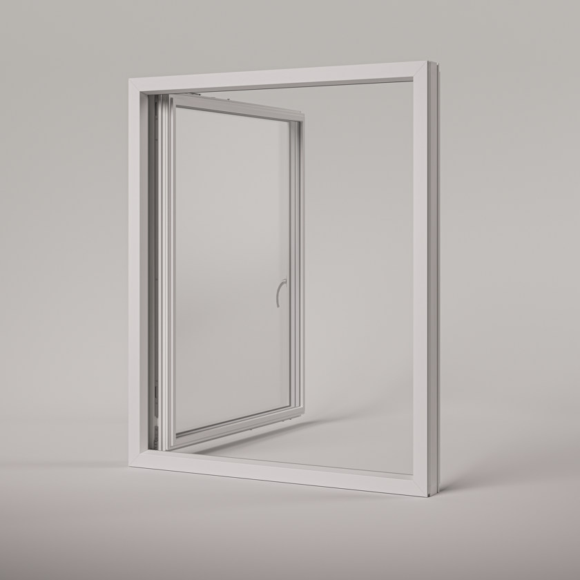 3) Loddrett stilling oppover = den sidehengslete funksjonen aktiveres og rammen kan åpnes innover til 90° åpning for pussing.